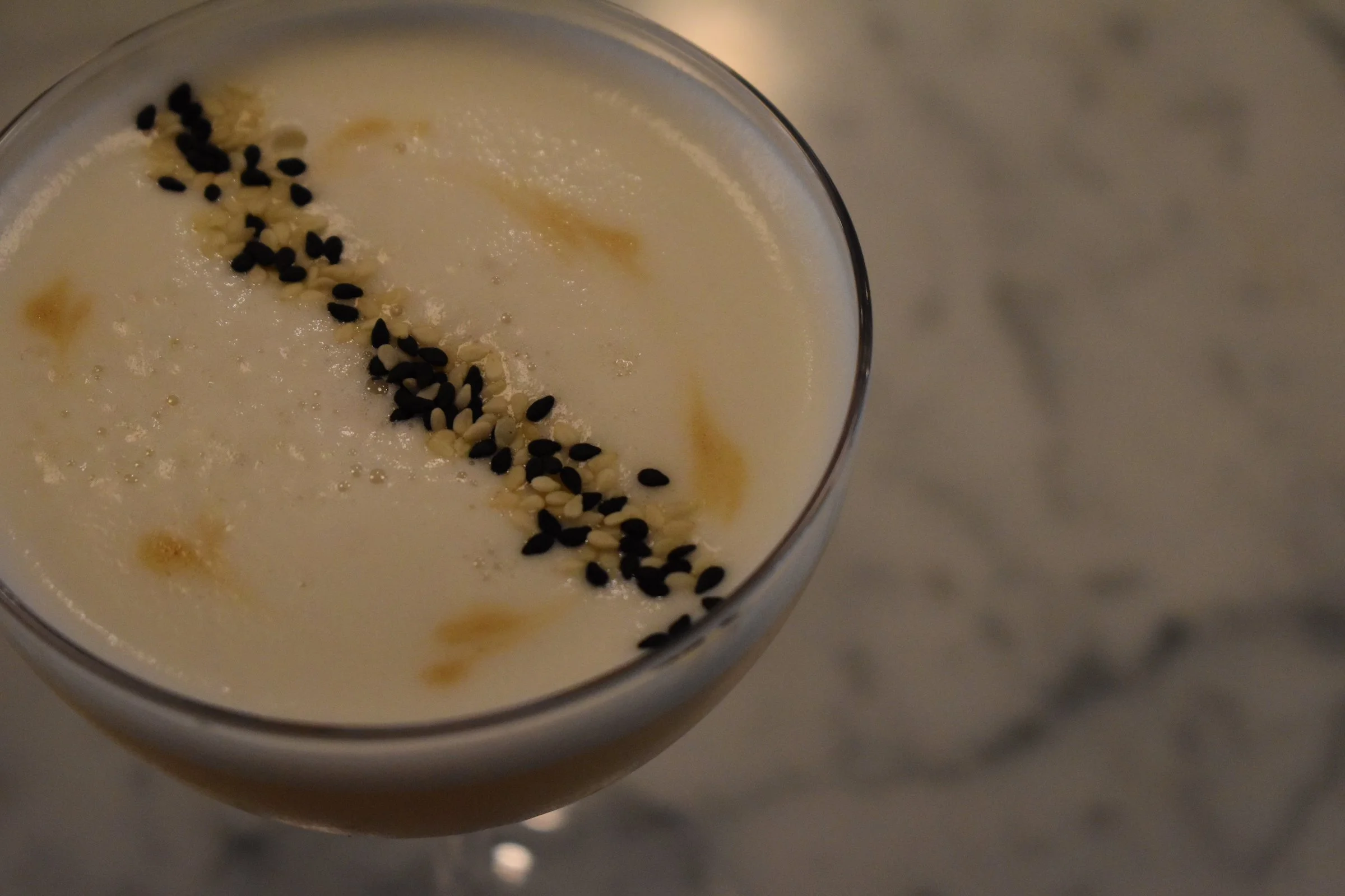 Garnish. Espresso-infused Giffard Crème de Cacao and sesame seeds.