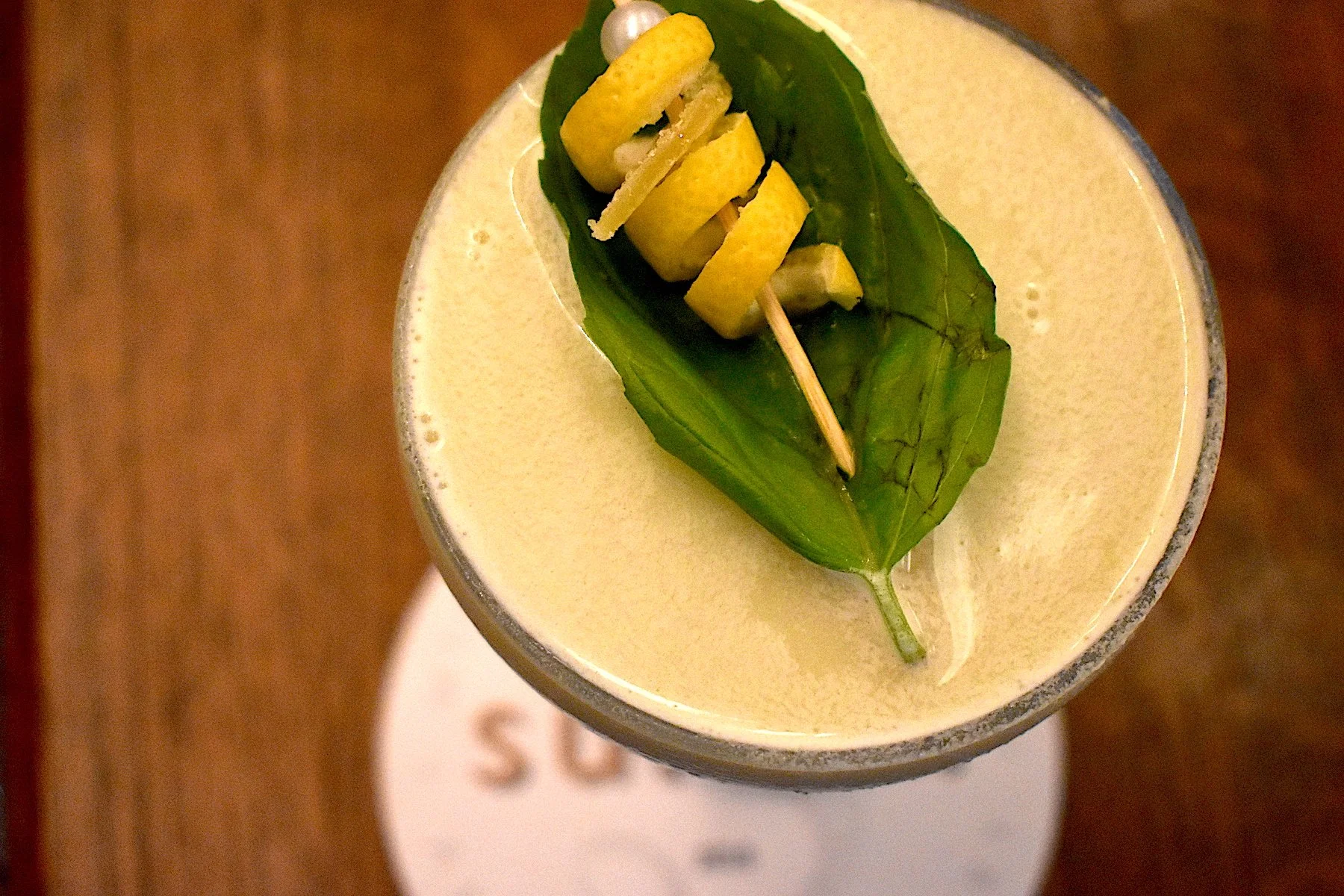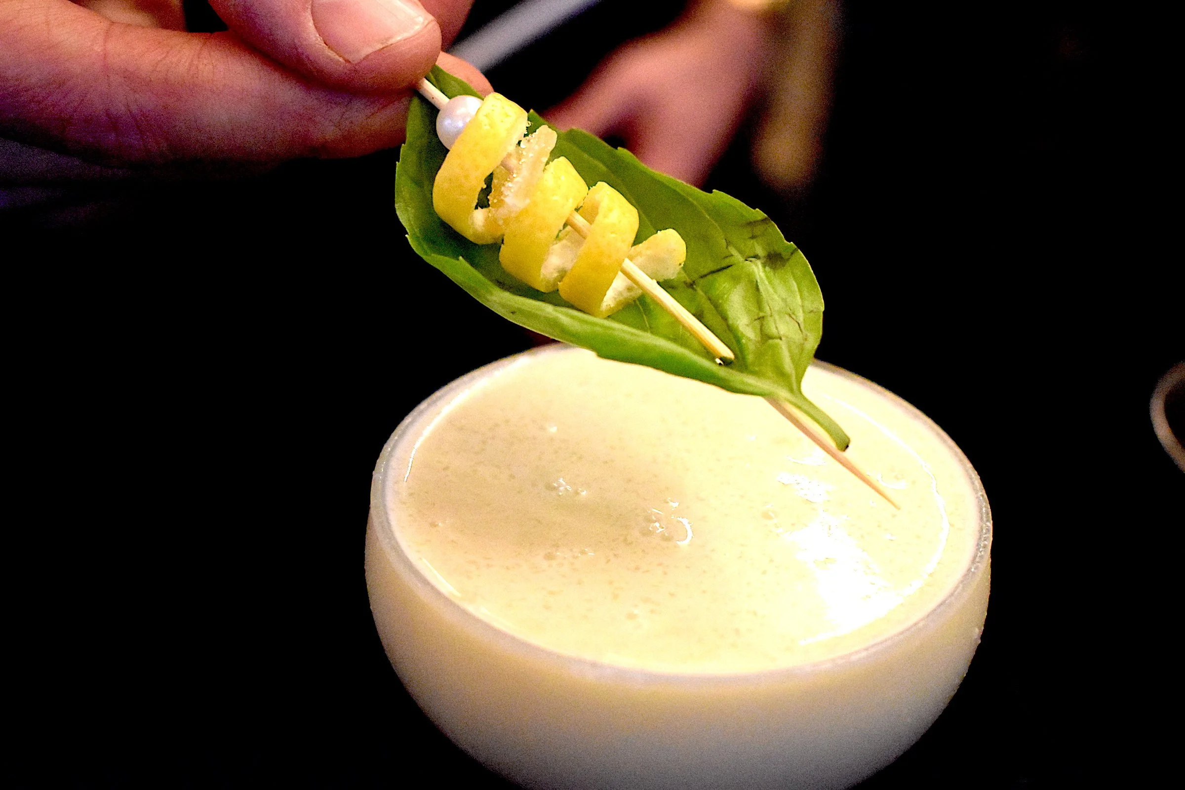 Garnish. Lemon peel and basil.